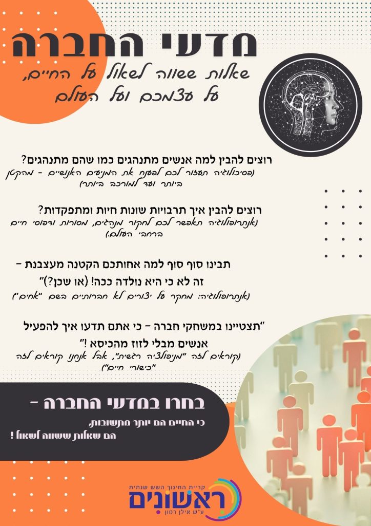 מגמת מדעי החברה מזמנת מפגש של התלמיד עם עצמו ועם החברה הסובבת אותו ומשלבת שני עולמות תוכן שונים: סוציולוגיה (2 יח"ל) ופסיכולוגיה (2 יח"ל).
